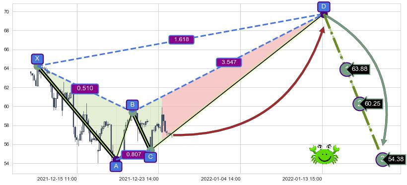 ➢ 谐波螃蟹:b下跌接近c:猜想支撑性拉升 → 上涨 →【拐点】支撑临近 → 大趋势均值回复