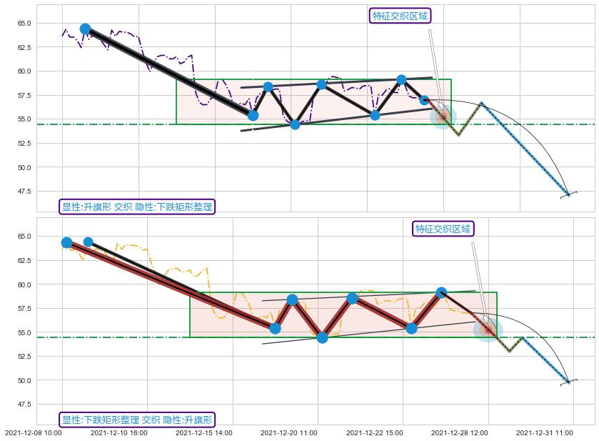 ➣ 下跌矩形整理:猜想临近关键支撑位突破点 → 临近拐点下跌 → 风险信号 → 大趋势均值回复