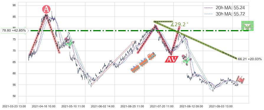 从2021-07-06 09:00至2021-08-27 10:00,共包含233个小时,阶段股价下跌-32.31%,阶段股价变动位移路程比: 1 : 5,下跌趋势角度: 29.2,2021-07-30 09:00向↘︎形成缺口,跳空下跌-18.17%˚