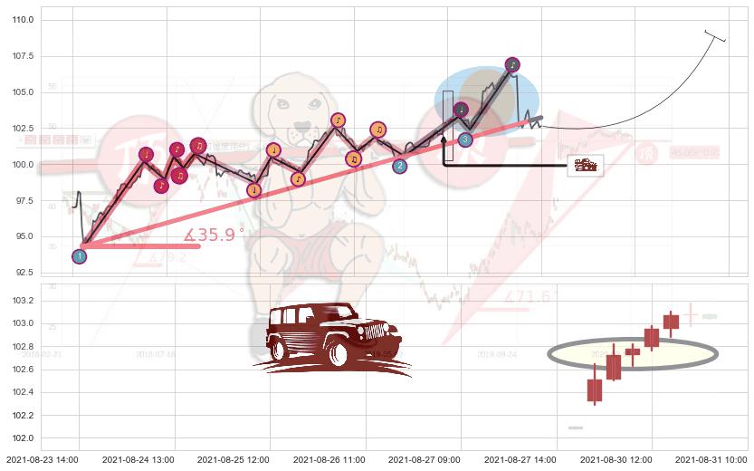 ➢ 🕰 价格走势在2021-08-30 09:00:00至2021-08-30 13:00:00期间形成低档五阳线,残存影响值:2.06