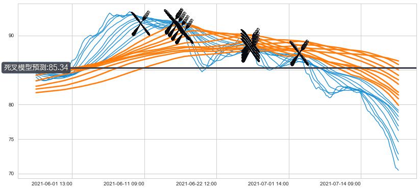➣ 70小时均线于(06-16 10:00: 91.56)形成【死叉】基于【死叉历史模型】预测死叉后最低波谷价格: 88.17, 死叉后最低价格70.21,已经下跌超出预测最低波谷价格, 预期反弹