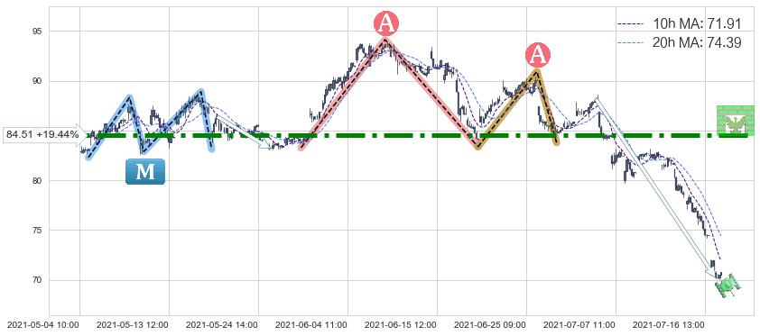 2021-06-29: 第一阻力位84.51有效抑制了下跌浪,成功阻止了价格的继续下跌。