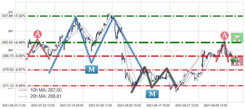 ♘ 阻力价格位293.93,可信任强度90.00%,距离最后交易2021-09-09 15:00形成的收盘价格286.88相差 +2.46%