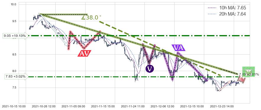 ♘ 阻力价格位7.83,可信任强度63.59%,距离最后交易2021-12-27 15:00形成的收盘价格7.60相差 +3.02%
