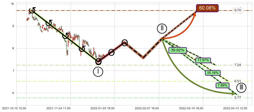 ➢ 循环浪继续向下【最低】位置(04-13:12, 5.77),匹配聚类样本比例19.76%, 可能性概率7.89%