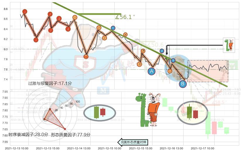 从2021-12-07 10:00至2021-12-21 09:00,共包含74个小时,阶段股价下跌-8.33%,阶段股价变动位移路程比: 1 : 5