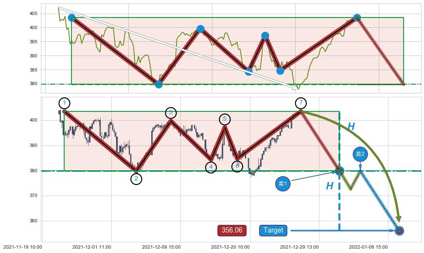 ➣ 下跌矩形整理:猜想临近关键支撑位突破点 → 临近拐点下跌 → 风险信号 → 大趋势均值回复