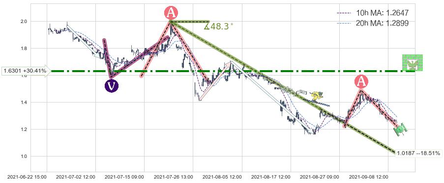 从2021-07-21 09:00至2021-08-24 09:00,共包含154个小时,阶段股价下跌-37.54%,阶段股价变动位移路程比: 1 : 5,下跌趋势角度: 48.3