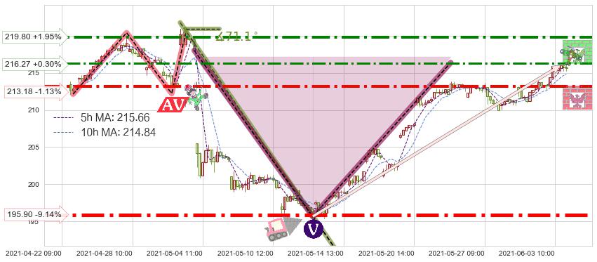 ♘ 阻力价格位216.27,可信任强度55.87%,距离最后交易2021-06-03 14:00形成的收盘价格215.61相差 +0.30%
