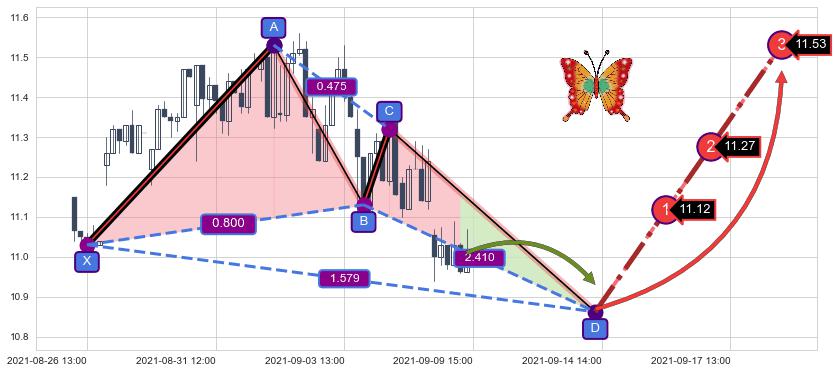 ➣ 未完成【蝴蝶】形态起点X: 08-26:13, 已到达C点: 09-07:14, 预测最终D点: 09-14:13, 共79交易小时