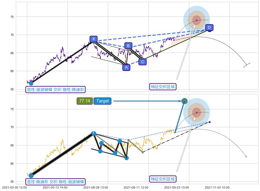 ➢ 降旗形临近target阻力拐点下跌 🔜 谐波蝴蝶临近d拐点下跌阻力 综合量化分数:51.47 【中性】