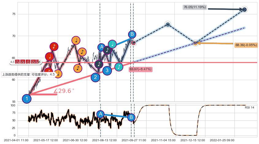 ♘ 在最后的上升阶段2021-04-05 13:00至2021-09-08 15:00存在 持续未破位的支撑位 ,支撑价格63.97,支撑可信任强度88.21%,其距离最后价格68.40相差 -6.47%