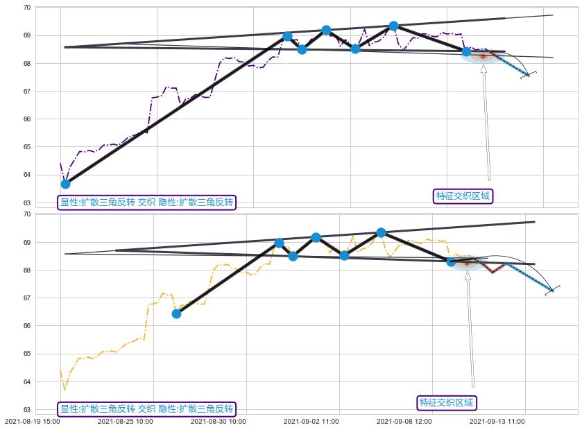 ➣ 扩散三角反转:猜想临近关键支撑位突破点 → 临近拐点下跌 → 风险信号 → 大趋势均值回复