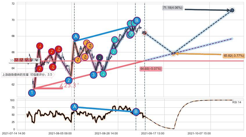 ♘ 在最后的上升阶段2021-07-19 13:00至2021-09-08 15:00存在 持续未破位的支撑位 ,支撑价格64.93,支撑可信任强度80.23%,其距离最后价格68.40相差 -5.07%