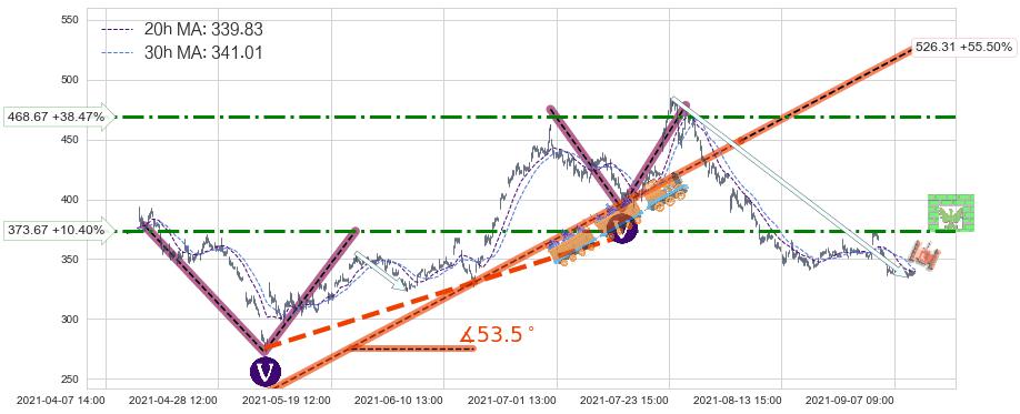 从2021-05-06 12:00至2021-08-06 13:00,共包含424个小时,阶段股价上涨39.12%,阶段股价变动位移路程比: 1 : 8,上涨趋势角度: 53.5