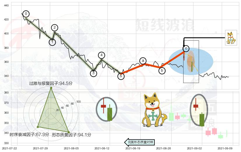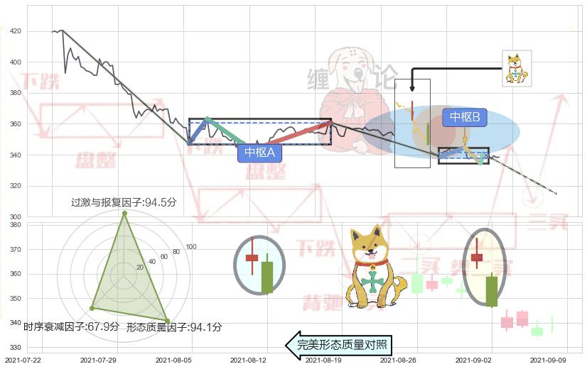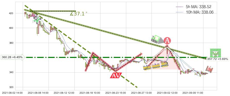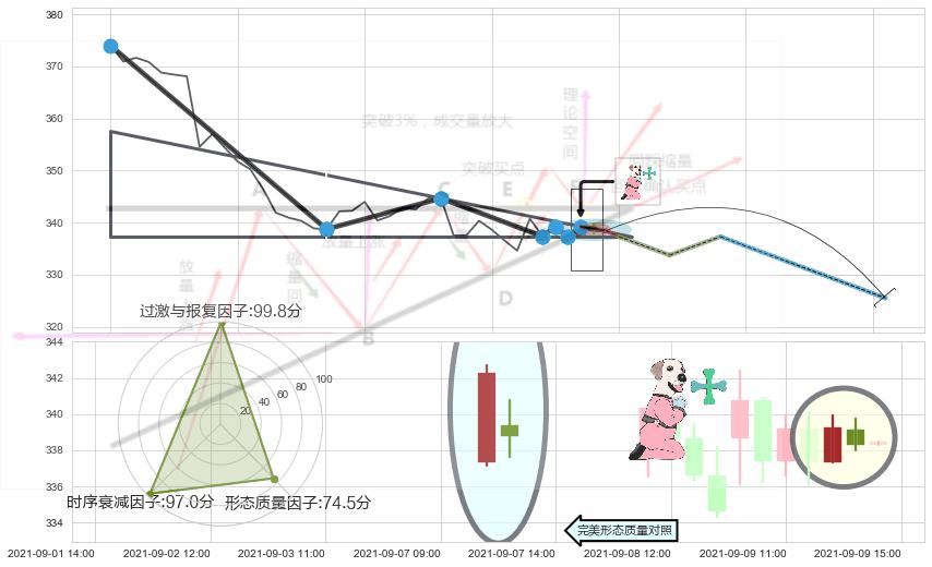 ♘ 在最后的下跌阶段2021-08-03 10:00至2021-09-08 14:00,存在 持续未破位的阻力位 ,阻力价格357.72,可信任强度86.99%,其距离最后价格338.46相差 +5.69%