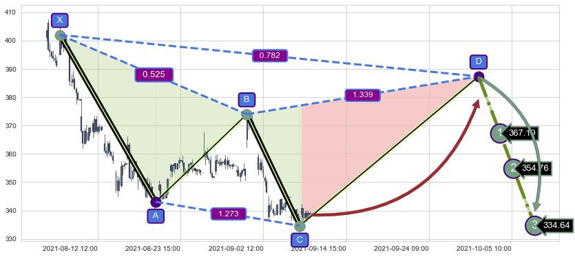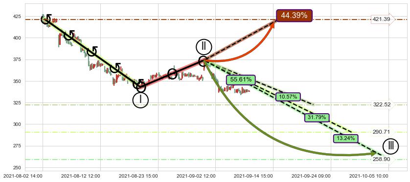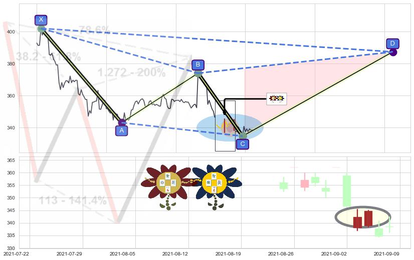 ➣ D点拟合预测价格387.32,距离最后交易收盘价格338.46相差 +14.43%