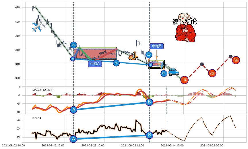 ➣ 缠论中枢点:猜想破位中枢B后持续下拉 → 下跌 → 破位中枢B支撑 → 持续趋势跟踪