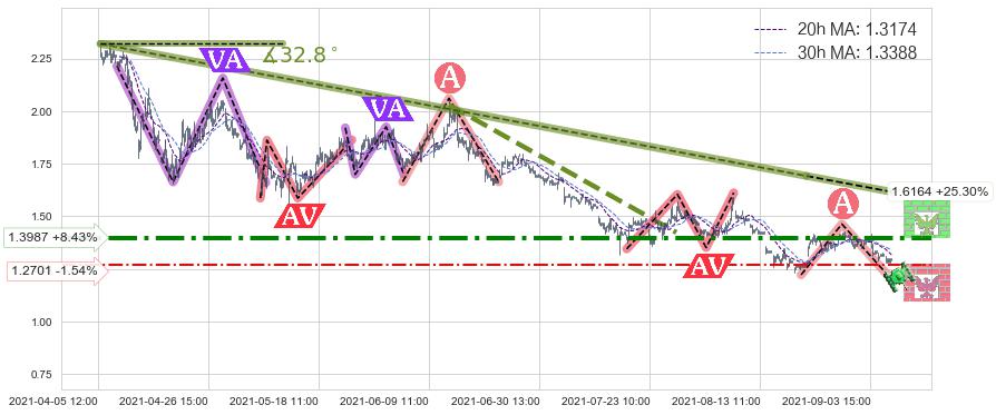 ♘ 在最后的下跌阶段2021-04-05 14:00至2021-08-23 14:00,存在 持续未破位的阻力位 ,阻力价格1.6164,可信任强度85.10%,其距离最后价格1.2900相差 +25.30%