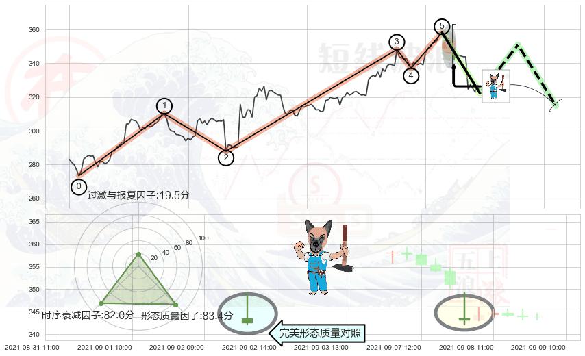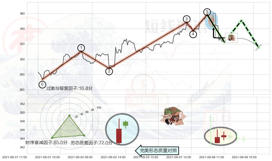 ➢ 🕰 价格走势在2021-09-08 10:00:00至2021-09-08 11:00:00期间形成顶部尽头线(下山虎),残存影响值:-3.72