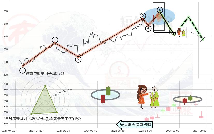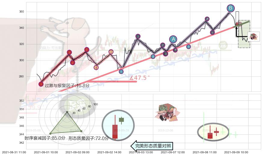 ➢ 2021-07-30 13:00-2021-09-07 14:00上升趋势存在反转[风险],其原上升趋势的支撑位(347.74)已破位[强阻力信号],原上升趋势角度: 47.5˚