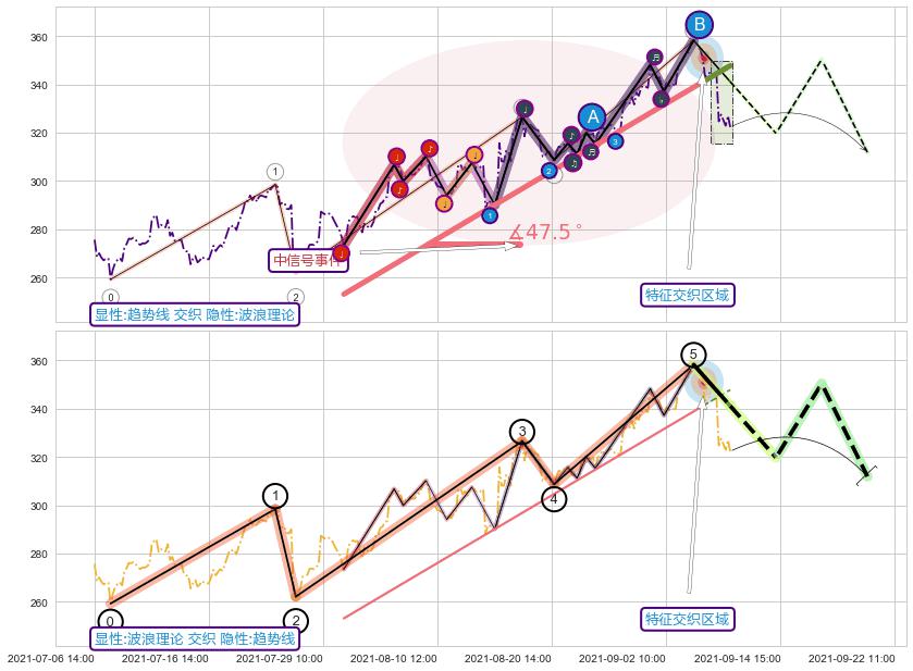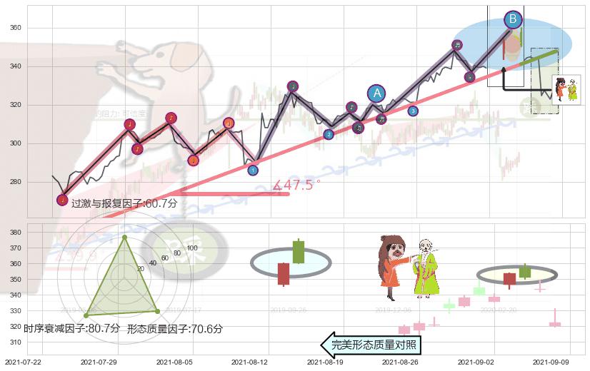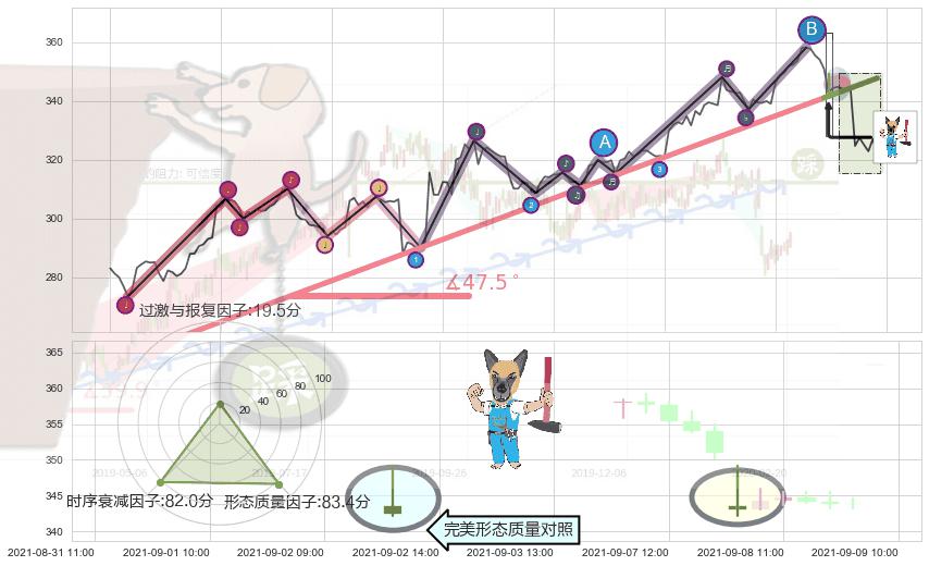 ➣ 2021-07-30 13:00-2021-09-07 14:00上升趋势存在反转[风险],其原上升趋势的支撑位(347.74)已破位[强阻力信号],原上升趋势角度: 47.5˚