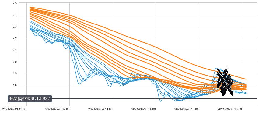 ➣ 120小时均线于(09-02 14:00: 1.7920)形成【死叉】基于【死叉历史模型】预测死叉后最低波谷价格: 1.6321, 死叉后最低价格1.7200,尚未达到预测最低波谷价格, 预期继续下跌