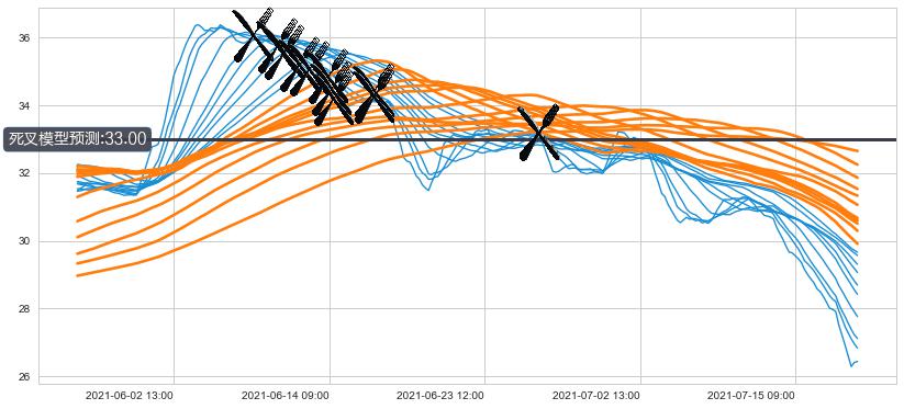 ➢ 30小时均线于(06-25 15:00: 33.17)形成【死叉】基于【死叉历史模型】预测死叉后最低波谷价格: 32.35, 死叉后最低价格26.07,已经下跌超出预测最低波谷价格, 预期反弹