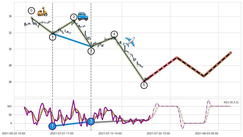 ➢ 第一, 三驱动浪端点:【KDJ】走势出现【常规背离 & 反转信号】背离程度79.41%,背离夹角角度50.3˚,背离程度较小