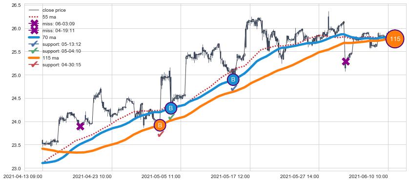 📝 多条均线形成死叉后走势最低价格达到: 21.72