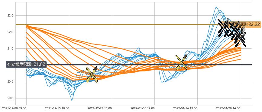 ➣ 34小时均线于(01-21 15:00: 22.06)形成【死叉】基于【死叉历史模型】预测死叉后最低波谷价格: 21.32, 死叉后最低价格21.72,尚未达到预测最低波谷价格, 预期继续下跌