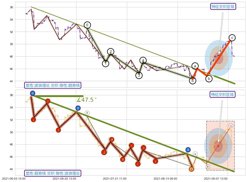 ➢ 2021-06-07 09:00-2021-08-31 10:00下跌趋势存在反转上涨[机会],其原下跌趋势的阻力位(43.56)已被突破[强支撑信号],原下跌趋势角度: 47.5˚