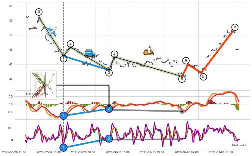➢ 第一, 三驱动浪端点:【KDJ】走势出现【常规背离 & 反转信号】背离程度93.12%,背离夹角角度96.8˚,背离程度中等