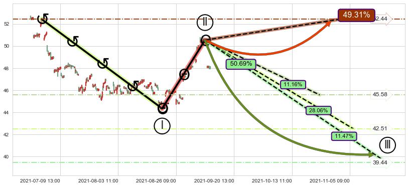 ➣ 调整浪已超过预测的c点位置,后续大趋势循环浪继续下跌概率50.69%,谨慎做多