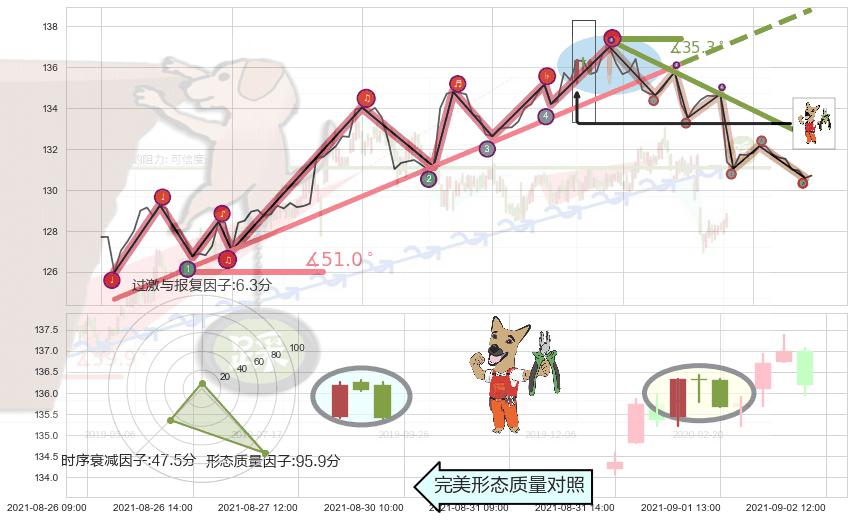 ➣ 2021-08-17 11:00-2021-09-07 09:00上升趋势存在反转[风险],其原上升趋势的支撑位(138.82)已破位[强阻力信号],原上升趋势角度: 51.0˚