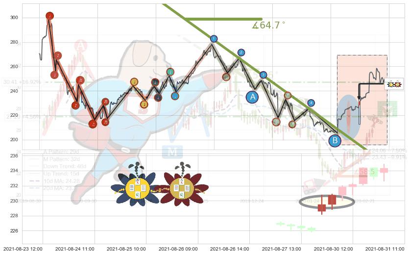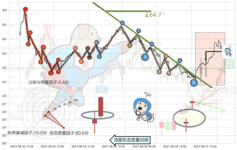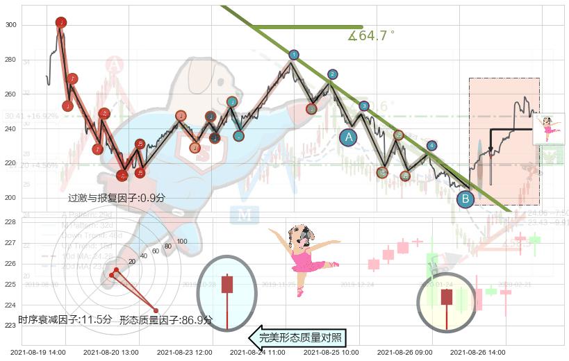 从2021-06-30 12:00至2021-08-23 09:00,共包含224个小时,阶段股价下跌-22.35%,阶段股价变动位移路程比: 1 : 6,下跌趋势角度: 55.4,2021-07-28 09:00向↘︎形成缺口,跳空下跌-8.03%˚