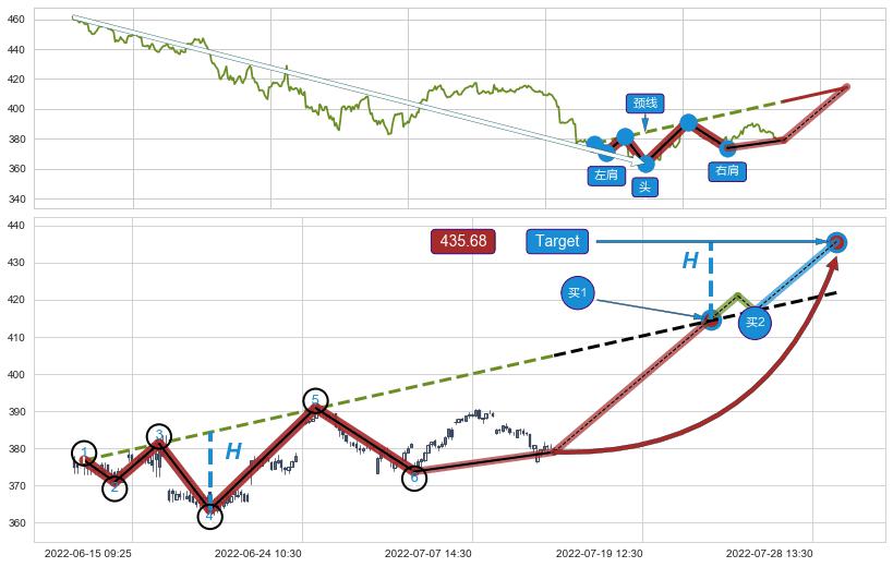 ➣ 头肩底:猜想临近关键阻力位突破点 → 临近拐点上涨 → 机会信号 → 大趋势均值回复