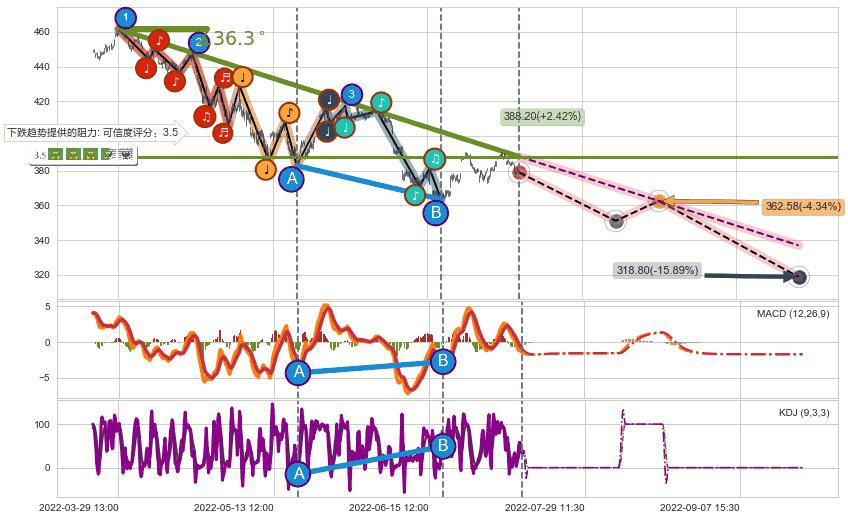 ➣ 预测:2022-08-18 13:30,【试探阻力】稳定目前下跌趋势的前提下,预测价格:362.58