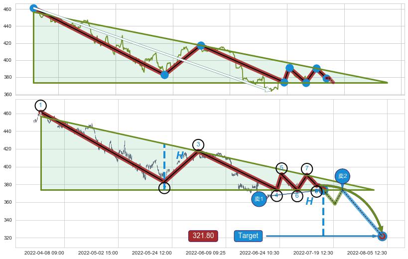 ➣ 下降三角整理:猜想临近关键支撑位突破点 → 临近拐点下跌 → 风险信号 → 大趋势均值回复