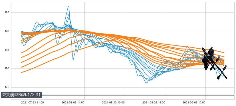 ➣ 34小时均线于(09-03 12:00: 183.78)形成【死叉】基于【死叉历史模型】预测死叉后最低波谷价格: 176.97, 死叉后最低价格176.50,虽然已经到达预测最低波谷价格,但耗时间很短动能很强, 预期继续下跌