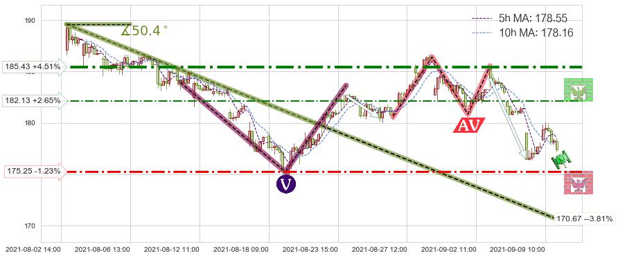 ♘ 阻力价格位182.13,可信任强度49.20%,距离最后交易2021-09-09 14:00形成的收盘价格177.43相差 +2.65%