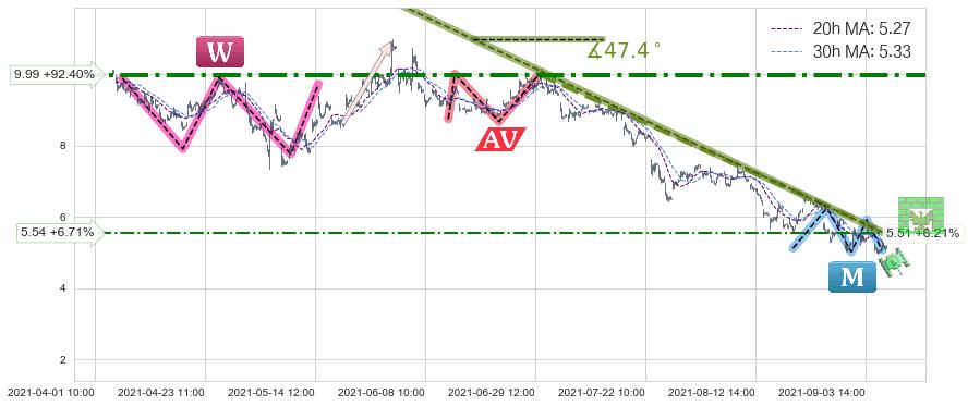 🦴 长线均值回复组合短线趋势跟踪[强阻力信号]2021-06-01 10:00-2021-09-09 14:00下跌趋势依然成立(下跌趋势跟踪依然存在),短线价格略微上行反弹(均值回复猜想),即将接近下跌趋势提供的未破位阻力价格:5.51。