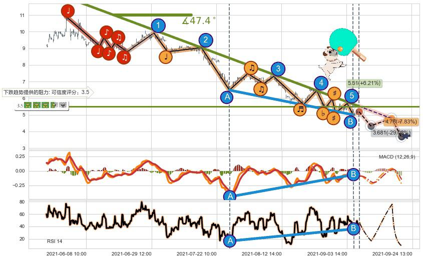 ➣ 预测:2021-09-22 10:00,【试探阻力】稳定目前下跌趋势的前提下,预测价格:4.78