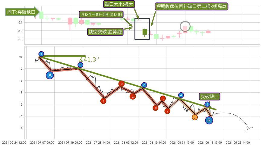 从2021-06-30 09:00至2021-09-09 13:00,共包含315个小时,阶段股价下跌-60.18%,阶段股价变动位移路程比: 1 : 5,下跌趋势角度: 41.3