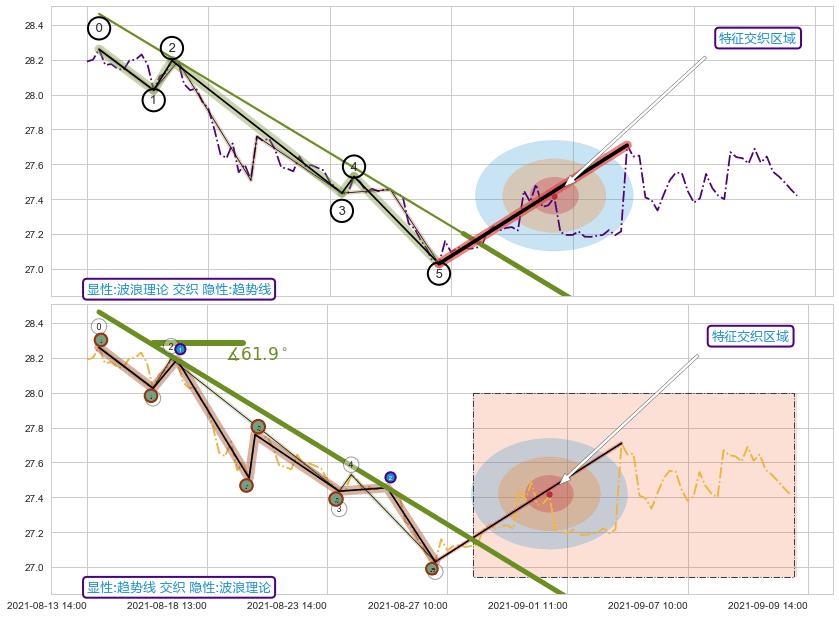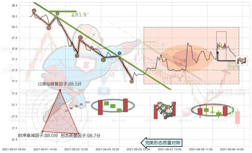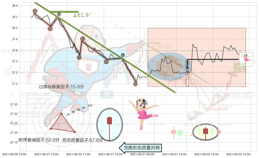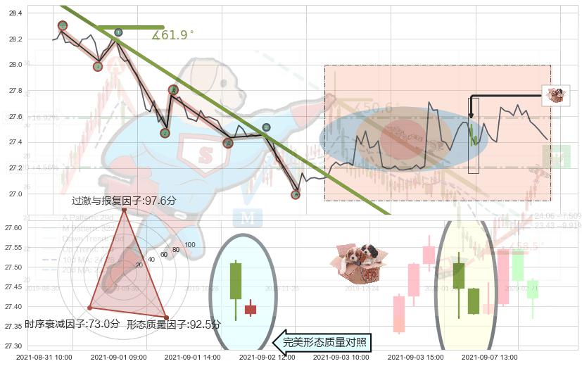 从2021-08-16 09:00至2021-08-27 12:00,共包含61个小时,阶段股价下跌-4.08%,阶段股价变动位移路程比: 1 : 2,下跌趋势角度: 61.9
