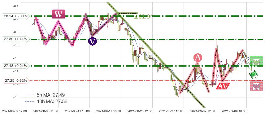 ♞ 5小时均线:27.49,10小时均线:27.56→ 快线<慢线