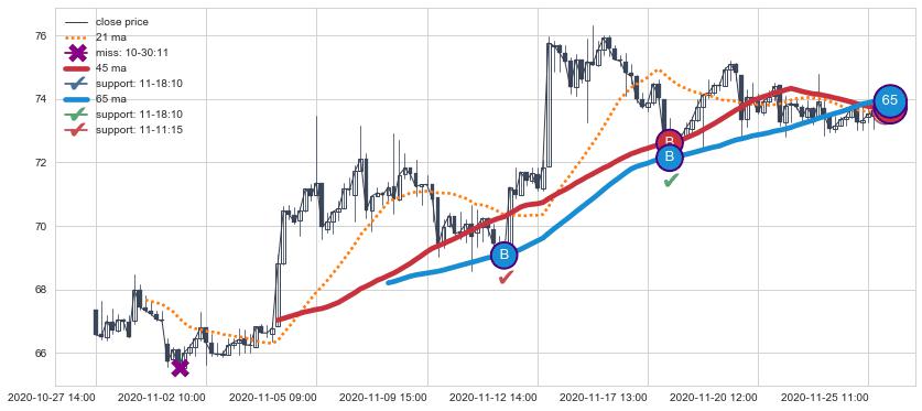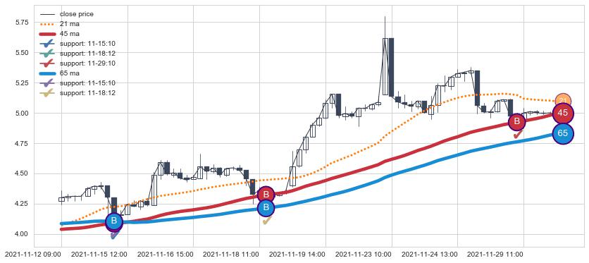 ➢ 最优均线组合共正确确认支撑阻力信号9处,正确确认率 64.29%