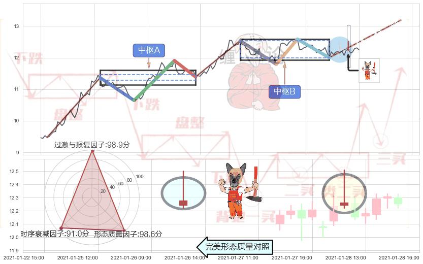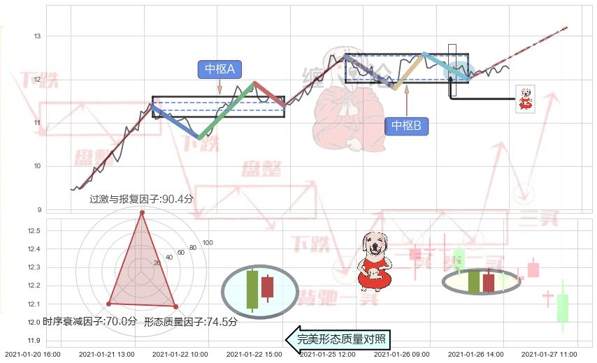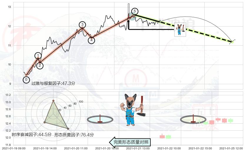 从2021-01-13 12:00至2021-01-25 11:00,共包含56个小时,阶段股价上涨9.56%,阶段股价变动位移路程比: 1 : 4
