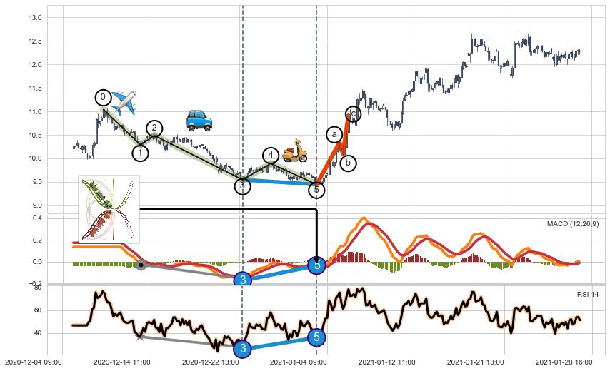 ➣ 第一, 三, 五浪下跌动能逐渐【衰弱变小】,趋势呈现不稳迹象