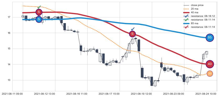 ➣ 80小时均线于(08-12 13:00: 16.94)形成【死叉】基于【死叉历史模型】预测死叉后最低波谷价格: 13.52, 死叉后最低价格12.52,已经下跌超出预测最低波谷价格, 预期反弹